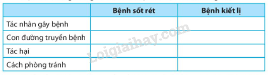 Em và bạn cùng thực hiện các hoạt động sau: -Tìm hiểu về bệnh sốt rét và bệnh kiết lỵ trên sách, báo, internet,… – Dựa vào những thông tin vừa tìm được để hoàn thành bảng sau: -Thiết kế một bản tuyên truyền về bệnh và cách phòng tránh hai bệnh trên.