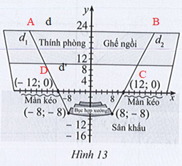 Hình 13 mô tả sơ đồ một sân khấu gắn với hệ trục tọa độ Oxy (đơn vị trên các trục tọa độ là 1 mét). Phần thính phòng giới hạn bởi hai đường thẳng d1 và d2 là vị trí ngồi của khán giả có thể nhìn thấy dàn hợp xướng. Gọi (x; y) là tọa độ ngồi của khán giả ở thính phòng. Viết hệ bất phương trình bậc nhất hai ẩn x, y mà khán giả có thể nhìn thấy dàn hợp xướng.