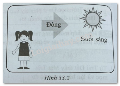 Vào một ngày tại một nơi Mặt Trời mọc lúc 6 giờ sáng và lặn lúc 6 giờ chiều. Em hãy cho biết thời điểm người quan sát thấy Mặt Trời ở vị trí như hình 33.2 là vào khoảng mấy giờ.