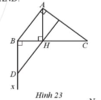 Cho tam giác ABC có \(\widehat {ABC} = 53^\circ ,\widehat {BAC} = 90^\circ \) , AH vuông góc với BC (H thuộc BC). Vẽ tia Bx vuông góc với BC. Trên tia Bx lấy điểm D sao cho BD = HA (Hình 23).