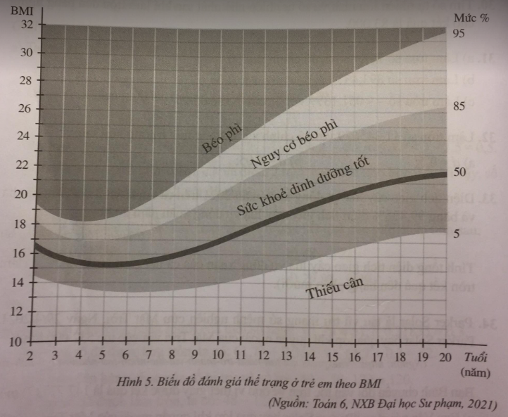 b) Biểu đồ ở Hình 5 cho ta đánh giá thể trạng của học sinh lớp 7 (độ tuổi 13) theo BMI như sau: