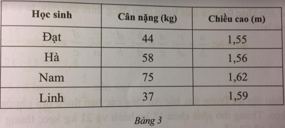 Kết quả (cân nặng, chiều cao) của bốn học sinh Đạt, Hà, Nam, Linh lớp 7A (độ tuổi 13) được cho trong Bảng 3.