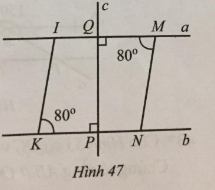 Quan sát Hình 47. a) Vì sao hai đường thẳng a và b song song với nhau? b) Tìm số đo góc MIK. c) Vì sao hai đường thẳng MN và IK song song với nhau?