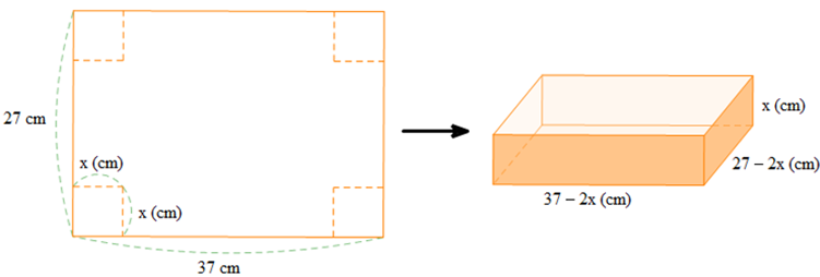 Từ một tấm bìa có dạng hình chữ nhật với độ dài các cạnh là 37 cm và 27 cm, người ta cắt đi ở bốn góc của tấm bìa bốn hình vuông cạnh là x cm và xếp phần còn lại thành một hình hộp chữ nhật không nắp.