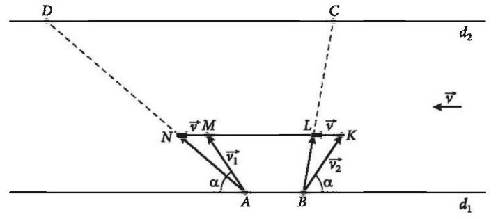 Lấy các điểm L, N sao cho \(\overrightarrow {KL}  = \overrightarrow v  = \overrightarrow {MN} \). Khi đó K, L, M, N cùng nằm trên một đường thẳng song song với \({d_1},{d_2}\) và các vecto \(\overrightarrow {AN}  = \overrightarrow {{v_1}}  + \overrightarrow v ,\overrightarrow {BL}  = \overrightarrow {{v_2}}  + \overrightarrow v \) tương ứng biểu diễn cho vận tốc thực của tàu 1 và tàu 2.