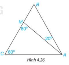 Cho tam giác ABC có \(\widehat {BCA} = {60^o}\) và điểm M nằm trên cạnh BC sao cho \(\widehat {BAM} = {20^\circ },\widehat {AMC} = {80^\circ }({\rm{H}}.4.26).\) Tính số đo các góc AMB, ABC, BAC.