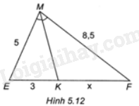 Tam giác MEF có MK là phân giác của góc EMF nên \(\frac{{EK}}{{KF}} = \frac{{ME}}{{MF}}\) (tính chất đường phân giác của tam giác) hay \(\frac{3}{x} = \frac{5}{{8,5}}\), suy ra \(x = \frac{{3.8,5}}{5} = 5,1\)