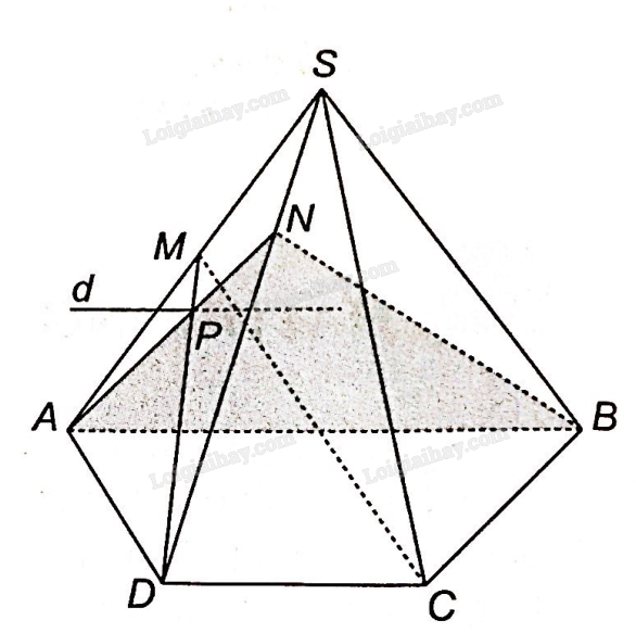 Gọi P là giao điểm của MD và NA trên mặt phẳng (SAD), vậy P là một điểm chung của (MCD) và (NAB). Vậy giao tuyến d sẽ là đường thẳng qua P, song song với AB, CD.