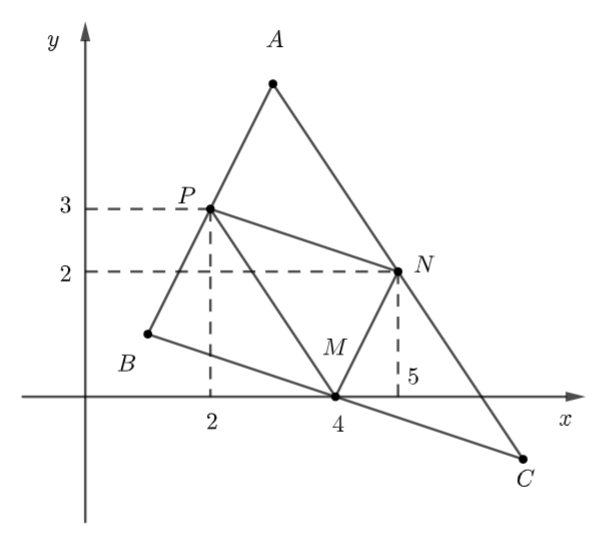 Trong mặt phẳng tọa độ \(Oxy\) cho ba điểm \(M(4;0),\,\,N(5;2)\) và \(P(2;3).\) Tìm tọa độ các đỉnh của tam giác \(ABC,\) biết \(M,\,\,N,\,\,P\) theo thứ tự là trung điểm các cạnh \(BC,\,\,CA,\,\,AB.\)
