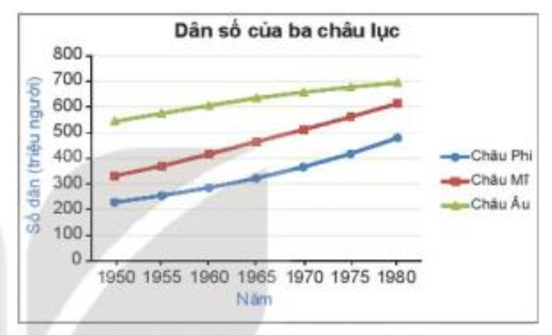 a) Từ năm 1950 đến năm 1980 dân số của ba châu lục đều có xu hướng tăng ( từ trái qua phải, các đường biểu diễn số liệu về dân số của ba châu lục đều có xu hướng đi lên).