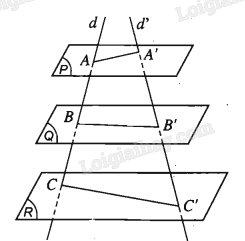Áp dụng định lí Thalès cho ba mặt phẳng đôi một song song (P), (Q), (R) và hai cát tuyến d, d’ ta có: \(\frac{{A’B’}}{{A’C’}} = \frac{{AB}}{{AC}} = \frac{2}{3}\)