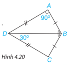 Cho Hình 4.20, biết \(AB = CB, AD = CD,\widehat{DAB} = {90^\circ },\widehat{BDC} = {30^\circ }\)