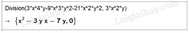 Vậy phép chia hai đa thức \(\left( {3{{\rm{x}}^4}y – 9{{\rm{x}}^3}{y^2} – 21{{\rm{x}}^2}{y^2}} \right)\) cho \(3{{\rm{x}}^2}y\), ta được thương là \({x^2} – 3{\rm{x}}y – 7y\) và dư 0.