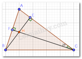Xét tam giác AFC có: \(\widehat {HCA} = 25^\circ \); \(\widehat {AFC} = 90^\circ \) (vì CF vuông góc với AB).