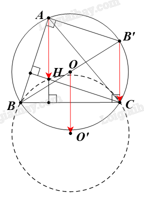 Ta đi chứng minh trực tâm H của tam giác ABC luôn nằm trên ảnh của đường tròn \(\left( {O;{\rm{ }}R} \right)\) qua phép tịnh tiến theo \(\overrightarrow {B’C} \)