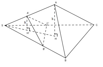 \(\displaystyle{{{V_{S.A’B’C’}}} \over {{V_{S.ABC}}}} = {{SA’} \over {SA}} \cdot {{SB’} \over {SB}} \cdot {{SC’} \over {SC}}\)