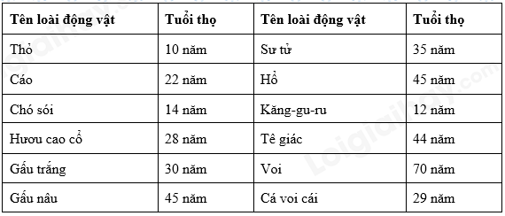 Tuổi thọ của một số loài động vật trong vườn thú được thống kê như sau: