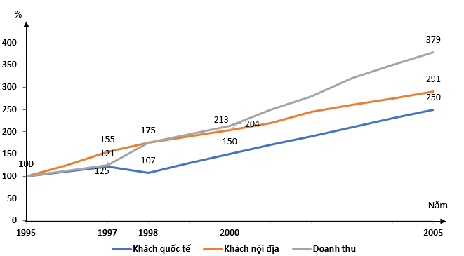 – Khách quốc tế cũng tăng lên nhanh chóng từ 100% (1995) lên 250% (2005).