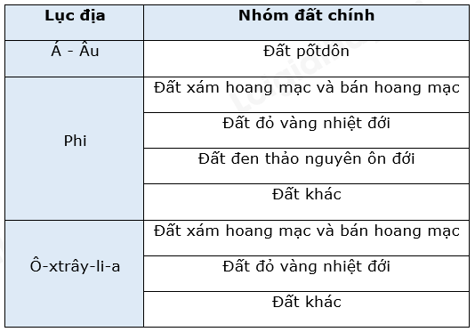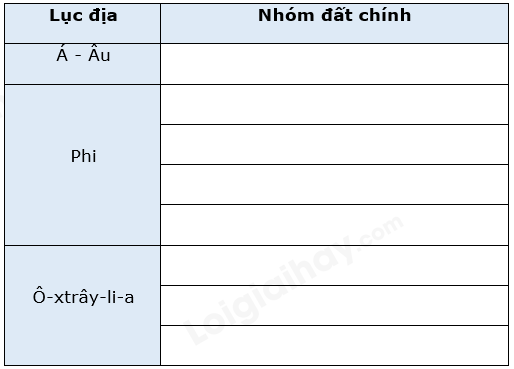 Dựa vào hình 19.4 trong SGK, em hãy điền một số nhóm đất chính theo lục địa vào bảng: