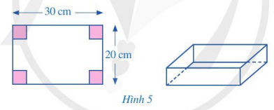 Từ tấm bìa hình chữ nhật có kích thước 20 cm và 30 cm, bạn Quân cắt đi ở mỗi góc của tấm bìa một hình vuông sao cho bốn hình vuông bị cắt đi có cùng độ dài cạnh, sau đó gấp lại để tạo thành hình hộp chữ nhật không nắp (Hình 5). Viết đa thức biểu diễn thể tích của hình hộp chữ nhật được tạo thành theo độ dài cạnh của hình vuông bị cắt đi.