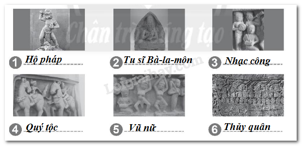 Giải bài 4 trang 64, 65 sách bài tập Lịch sử 6- Chân trời sáng tạo. Các nhà sử học phải sử dụng tư liệu lịch sử, để có được một bức tranh lịch sử gần đúng nhất với những gì xảy ra, hoặc đã từng có trong quá khứ. Trải nghiệm công việc của một nhà sử học, em hãy quan sát và sắp xếp những nhân vật (từ số 1 đến số 6) vào sơ đồ 1 (trang 65). Khi đã chắc chắn rồi, em hãy viết tên những thành phần trong xã hội Chăm-pa tương ứng với các nhân vật trong các tác phẩm đó của nghệ thuật cổ Chăm-pa.