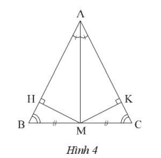 Chứng minh: \(\Delta BMH = \Delta CMK\) suy ra \(\widehat B = \widehat C\)