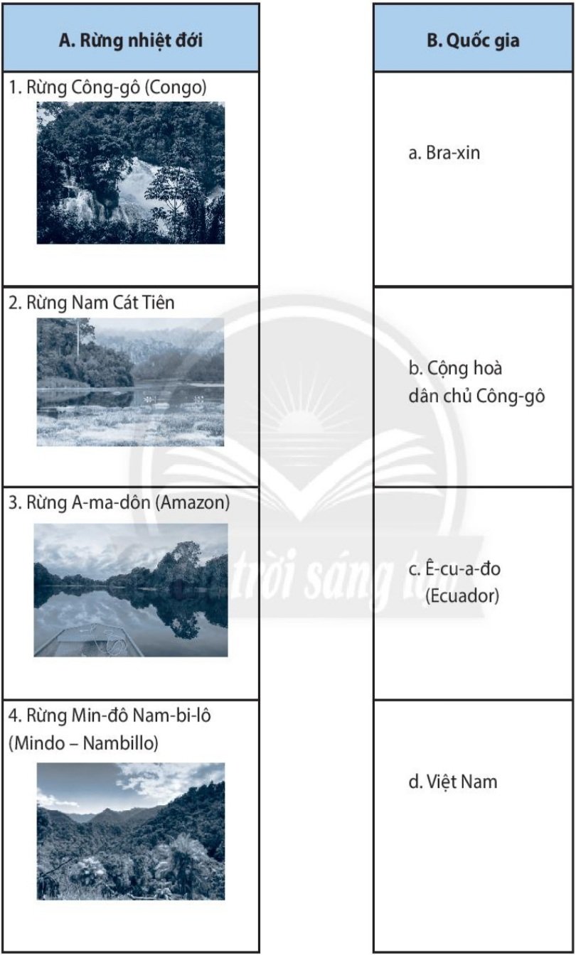 Dựa vào bảng thông tin trong SGK, ghép cặp rừng nhiệt đới ở cột A với các quốc gia ở cột B cho phù hợp.