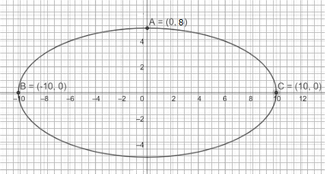 Ta có chiều cao 8 m nên \(OA = b = 8\), chiều rộng của vòm là 20 m, suy ra \(BC = 2a = 20 \Rightarrow a = 10\).