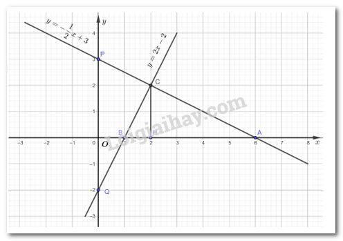 Vì C là hoành độ giao điểm của hai đường thẳng \(y =  – \dfrac{1}{2}x + 3\) và y = 2x – 2 nên C(2; 2)