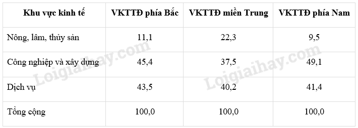– Về nông – lâm – thủy sản: VKTTĐ miền Trung chiếm tỉ lệ cao nhất trong cơ cấu (22,3%), trong khi VKTTĐ phía Bắc và phía Nam là 11,1% và 9,5%.