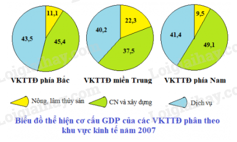 Dựa vào bảng số liệu đã cho, hãy vẽ biểu đồ thể hiện cơ cấu GDP của các VKTTĐ phân theo khu vực kinh tế năm 2007. Nhận xét và giải thích cơ cấu đó.