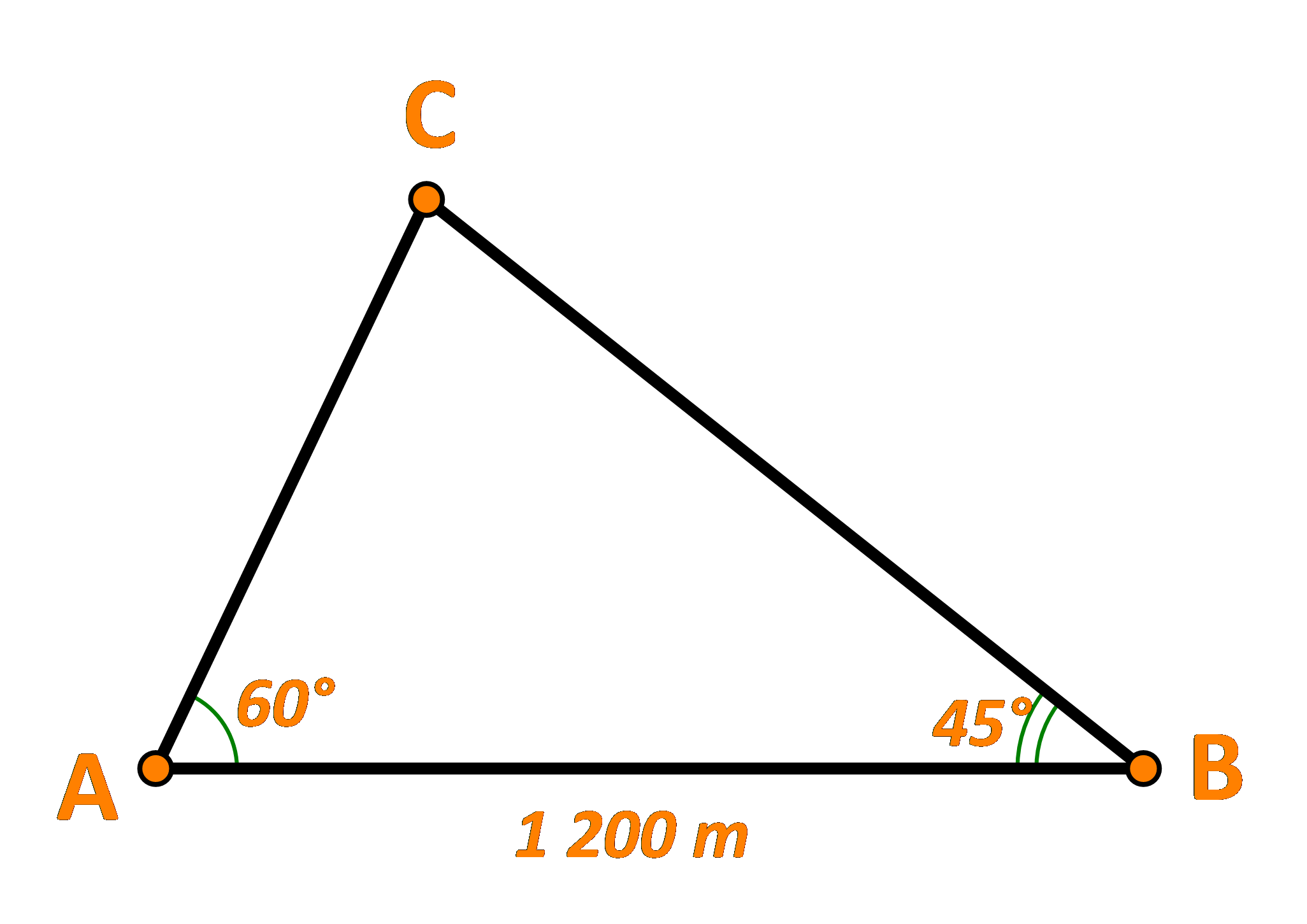 \( \Rightarrow \left\{ \begin{array}{l}AC = \frac{{\sin B.AB}}{{\sin C}}\\BC = \frac{{\sin A.AB}}{{\sin C}}\end{array} \right. \Leftrightarrow \left\{ \begin{array}{l}AC = \frac{{\sin {{45}^o}.1200}}{{\sin {{75}^o}}} \approx 878\\BC = \frac{{\sin {{60}^o}.1200}}{{\sin {{75}^o}}} \approx 1076\end{array} \right.\)