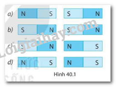 Có hai thanh nam châm giống hệt nhau được lần lượt xếp như Hình 40.1. Trong những trường hợp nào có lực đẩy, có lực hút ? Lực tác dụng giữa hai thanh nam châm là lực tiếp xúc hay không tiếp xúc ?