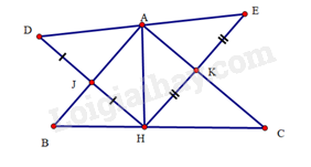 Cho tam giác \(ABC\) vuông tại \(A\) có đường cao \(AH\). Kẻ \(HJ\) vuông góc với \(AB\) tại \(J\) và \(HK\) vuông góc với \(AC\) tại \(K\). Trên tia \(HJ\) lấy điểm \(D\) sao cho \(DJ = JH\). Trên tia \(HK\) lấy điểm \(E\) sao cho \(EK = KH\).