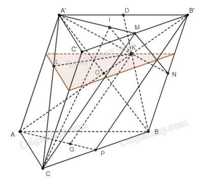 Mặt khác, do \(K\) là trọng tâm tam giác \(\left( {A’B’B} \right)\) nên \(B’K\) đi qua trung điểm của \(A’B\). Vì \(ABB’A’\) là hình bình hành, nên ta suy ra \(AB’\) cũng đi qua trung điểm của \(A’B\). Do vậy, ba điểm \(A\), \(K\), \(B’\) thẳng hàng. Từ đó, mặt phẳng \(\left( {AGK} \right)\) chính là mặt phẳng \(\left( {AB’P} \right)\).