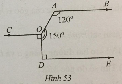 Cho Hình 53OCDE cùng vuông góc với OD, \(\widehat {BAO} = 120^\circ ,{\rm{ }}\widehat {AOD} = 150^\circ \).