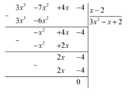 Vậy \((3{x^3} – 7{x^2} + 4x – 4):(x – 2) = 3{x^2} – x + 2\)