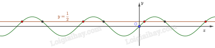 Từ hình vẽ, ta thấy giá trị của \(x\) để \(\sin x = \frac{1}{2}\) là hoành độ giao điểm của đường thẳng \(y = \frac{1}{2}\) với đồ thị hàm số \(y = \sin x\). Dựa vào hình vẽ trên, ta thấy \(\sin x = \frac{1}{2}\) khi \(x = \frac{\pi }{6} + k2\pi \) (các giao điểm màu đỏ) và \(x = \frac{{5\pi }}{6} + k2\pi \) (các giao điểm màu đen), với \(k \in \mathbb{Z}\).