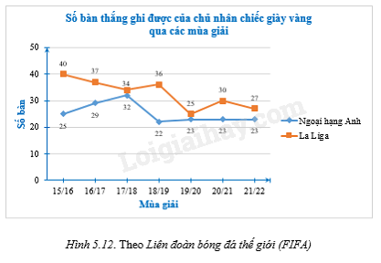 Biểu đồ Hình 5.12, cho biết số bàn thắng ghi được của chủ nhân chiếc giày vàng tại giải ngoại hạng Anh và La Liga (giải vô địch quốc gia Tây Ban Nha trong một số năm gần đây.