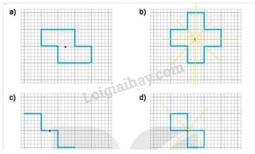Hình 5.14 là một đường gấp khúc có độ dài bằng 4 đơn vị. Em hãy vẽ thêm vào hình đó: a) Một đường gấp khúc có độ dài bằng 6 đơn vị để được một hình có tâm đối xứng nhưng không có trục đối xứng; b) Một đường gấp khúc có độ dài bằng 8 đơn vị để được một hình có tâm đối xứng và có bốn trục đối xứng; c) Một đường gấp khúc có độ dài ngắn nhất để được một hình có tâm đối xứng; d) Một đường gấp khúc có độ dài ngắn nhất để được một hình có tâm đối xứng và có trục đối xứng.