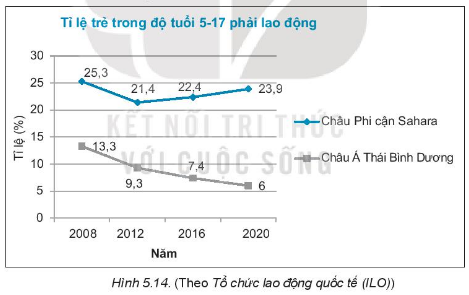 a) Biểu đồ biểu diễn dãy số liệu về tỉ lệ trẻ em độ tuổi 5 – 17 phải lao động ở 2 khu vực châu Phi cận Sahara và châu Á Thái Bình Dương trong các năm từ 2008 đến 2020.