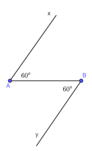 Bài 5 (3.16). Cho đoạn thẳng AB. Vẽ hai tia Ax, By sao cho chúng tạo với AB hai góc so le trong có cùng số đo bằng \({60^o}\)(\(\widehat {xAB} = \widehat {yBA} = {60^o}\)). Trên hình vừa vẽ, hai đường thẳng chứa hai tia Ax và By có song song với nhau không? Vì sao?