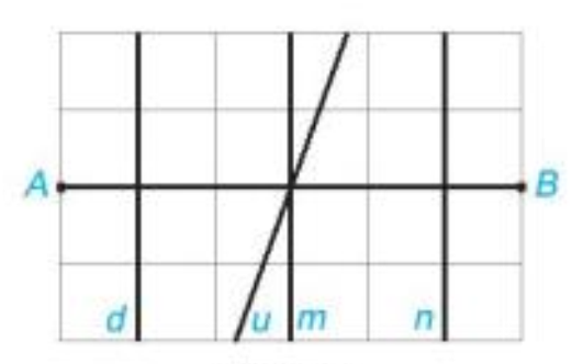 Bài 5 (4.27). Trong hình dưới đây, đường thẳng nào là đường trung trục của đoạn thẳng AB.