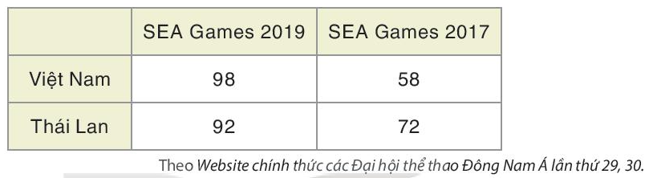 Bảng thống kê sau biểu diễn số huy chương vàng trong hai kì SEA Games năm 2017 và 2019 của đoàn thể thao Việt Nam, Thái Lan.