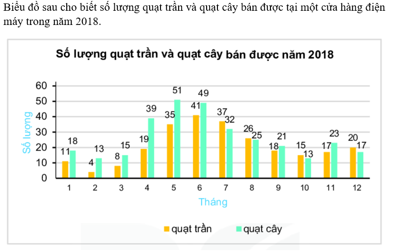 Từ biểu đồ ta thấy hầu hết các cột màu xám nhạt cao hơn so với các cột màu xám đậm ở cùng tháng trừ các tháng 7, 8, 10, 12 với số lượng chênh lệch không lớn (tương ứng là 5; 1; 2; 3). Trong khi đó chỉ riêng tháng 4, số quạt cây bán được nhiều hơn số quạt trần là 20 chiếc. Do vậy sô lượng quạt cây bán được tại cửa hàng điện máy nhiều hơn so với số lượng quạt trần.