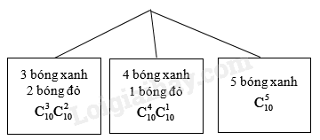 Một hộp chứa 10 quả bóng xanh và 10 quả bóng đỏ có kích thước và khối lượng như nhau. Lấy ra ngẫu nhiên đồng thời 5 quả bóng từ hộp. Sử dụng sơ đồ hình cây, tính xác suất của biến cố “Có ít nhất 3 quả bóng xanh trong 5 quả bóng lấy ra”.