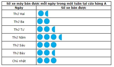 Bằng cách dùng biểu tượng hình tròn đại diện cho 10 xe và biểu tượng nửa hình tròn đại diện cho 5 xe, em hãy vẽ biểu đồ tranh biểu diễn bảng thống kê sau: Số xe máy bán được mỗi ngày trong một tuần tại cửa hàng A Ngày Số xe bán được Thứ Hai 15 Thứ Ba 20 Thứ Tư 25 Thứ Năm 35 Thứ Sáu 40 Thứ Bảy 25 Chủ nhật 30