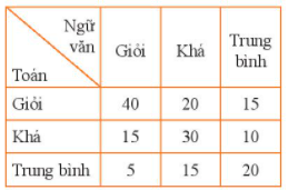 Kết quả kiểm tra môn Toán và Ngữ văn của một số học sinh được lựa chọn ngẫu nhiên cho ở bảng sau: Hãy tính xác suất thực nghiệm của sự kiện một học sinh được chọn ra một cách ngẫu nhiên có kết quả: a) Môn Toán đạt loại giỏi; b) Loại khá trở lên ở cả hai môn, c) Loại trung bình ở ít nhất một môn.
