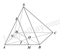 Khi đó, \(\left( P \right) \cap \left( {SAB} \right) = JM,\left( P \right) \cap \left( {SAD} \right) = JN,\left( P \right) \cap \left( {ABCD} \right) = NM\)