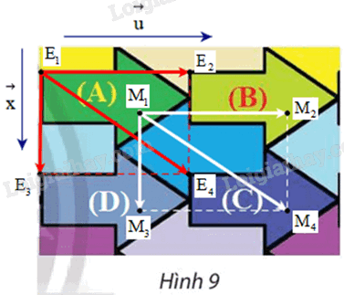 Trong Hình 9, tìm các vectơ \(\vec u\) và \(\vec v\) sao cho phép tịnh tiến \({T_{\vec u}}\)biến hình mũi tên (A) thành hình mũi tên (B) và phép tịnh tiến \({T_{\vec v}}\) biến hình mũi tên (A) thành hình mũi tên (C).